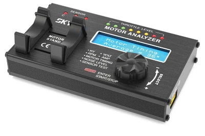 SKYRC motor analyzer is a precision electronic device that is especially designed for measuring the KV value, RMP, current drawn, motor timing, vibration noise level and checking the function of hall effect sensors of a brushless motor. It comes with a 2X16 characters LCD that is able to display real time measuring value of either sensor or sensor-less brushless motor.